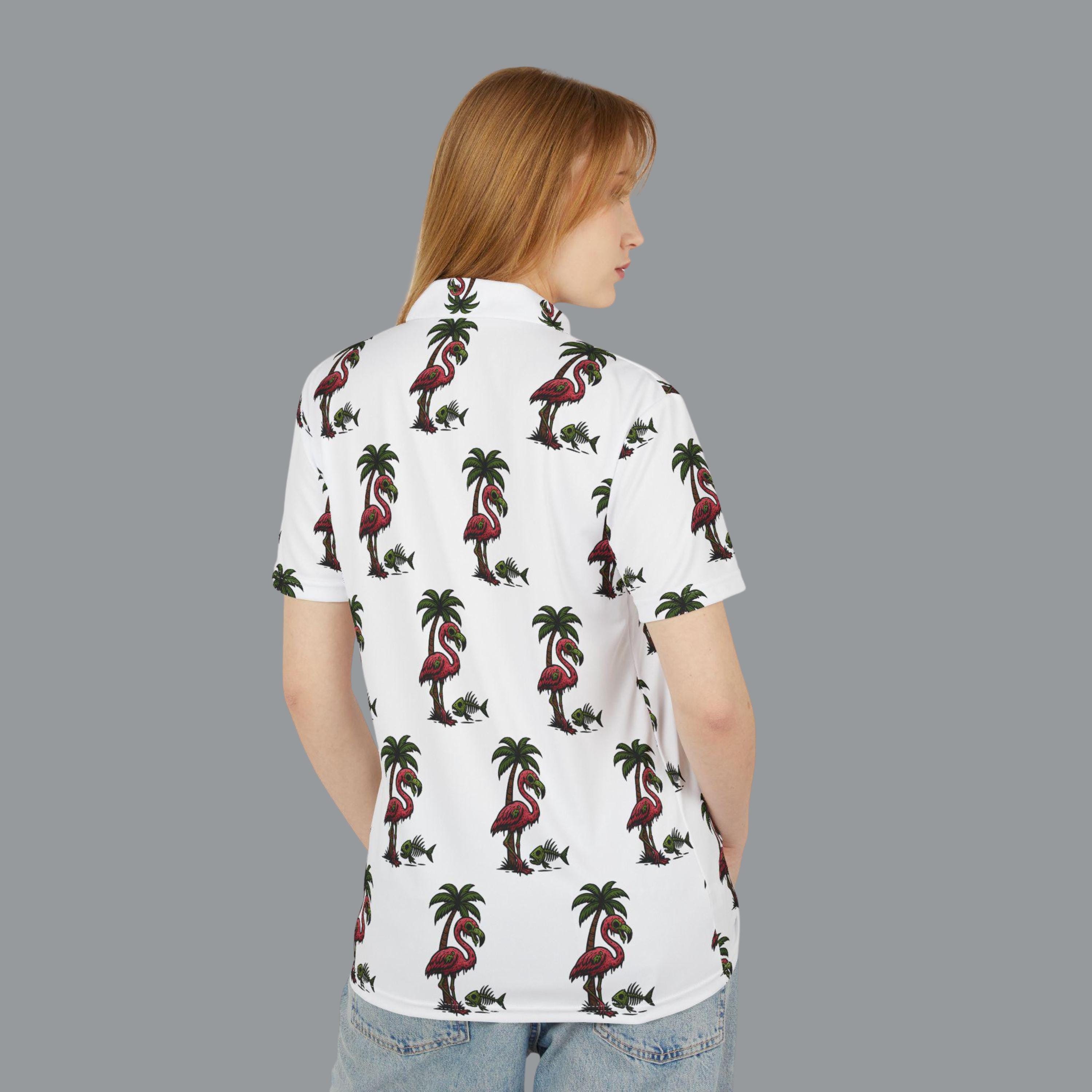 A unique and quirky Polo Shirt featuring a zombie flamingo with a palm tree and fish skeleton design. Perfect for those who love bold and eccentric styles. Ideal for casual wear and a fun addition to any wardrobe. Relevant for Halloween, beach vacations, and tropical-themed parties.