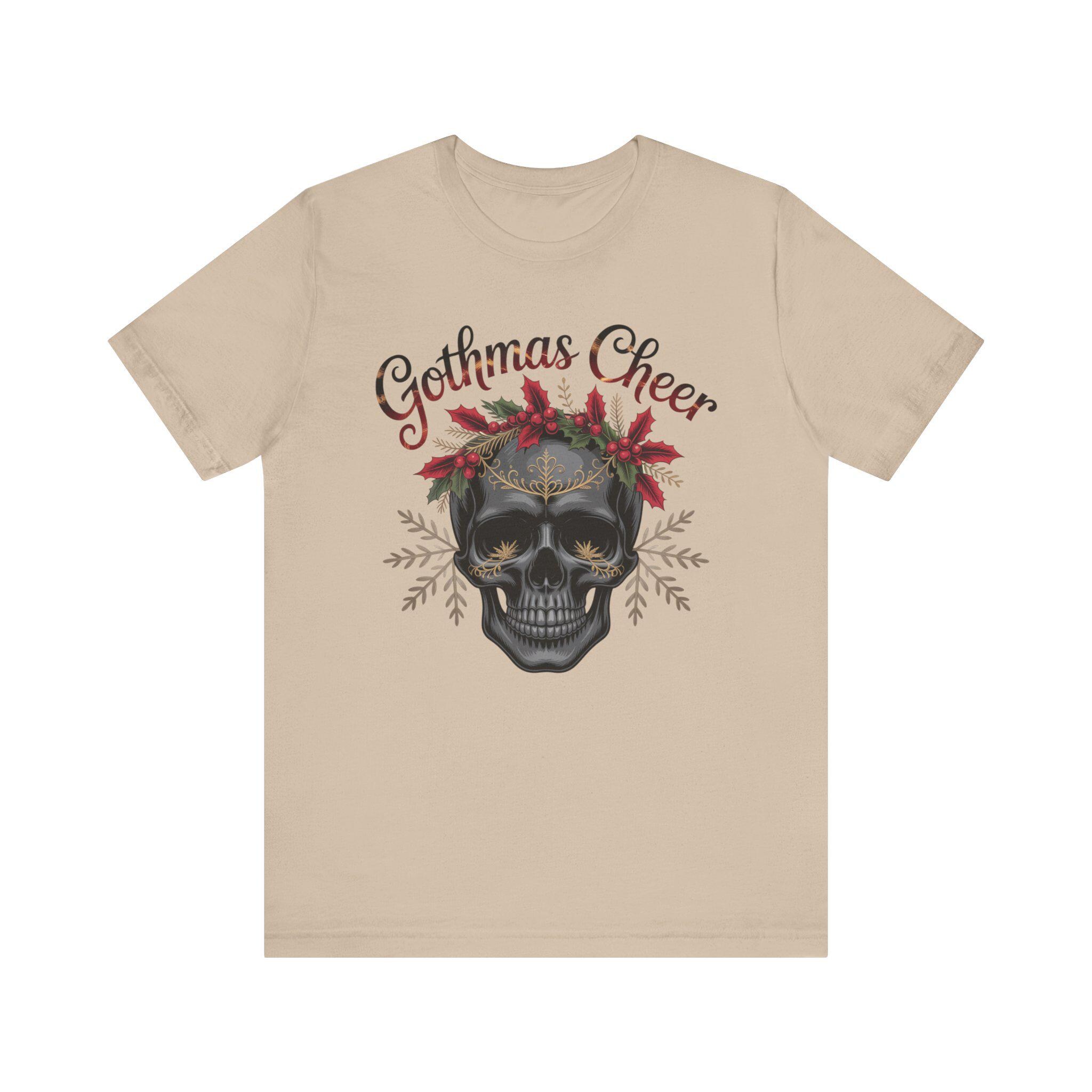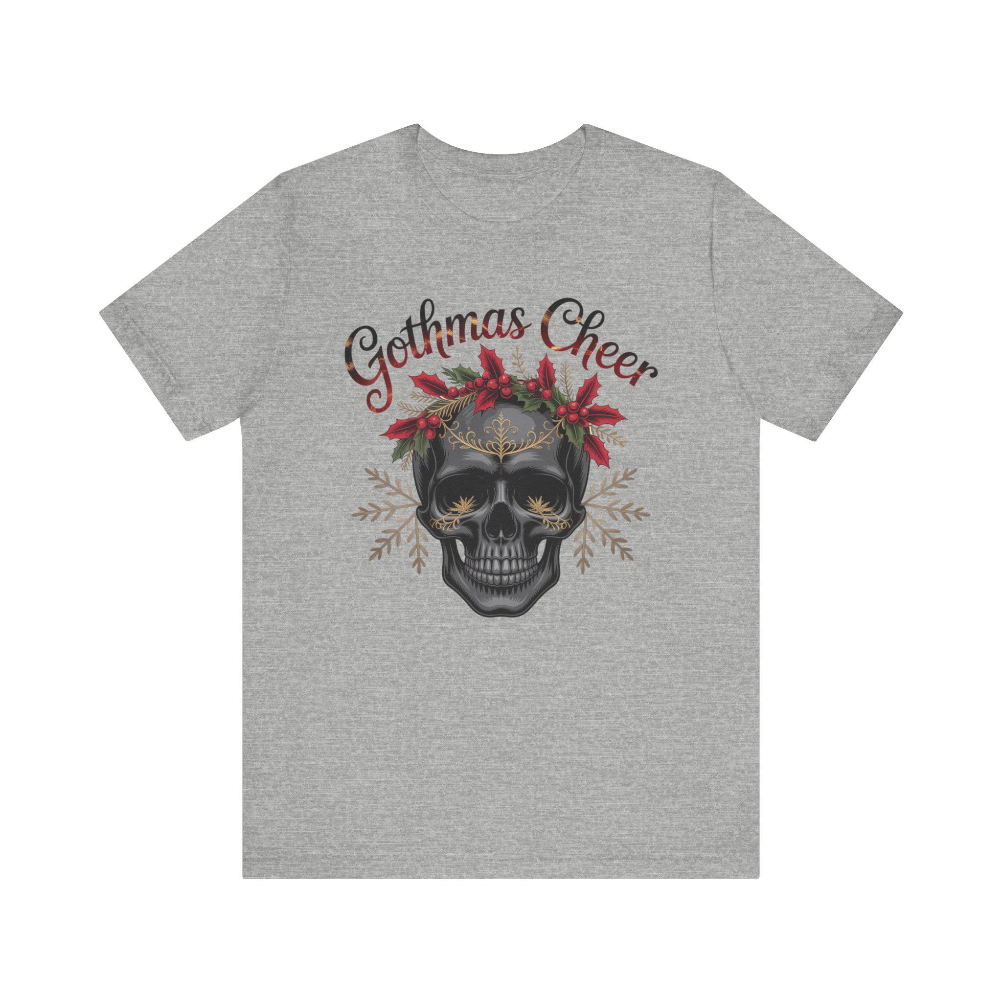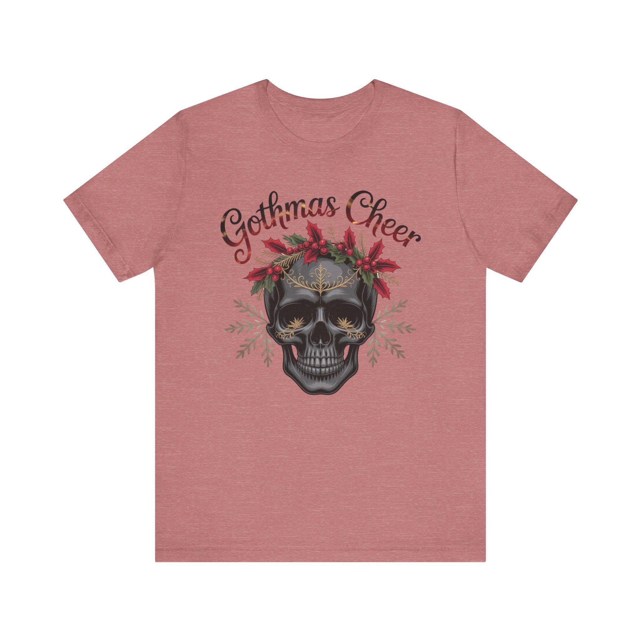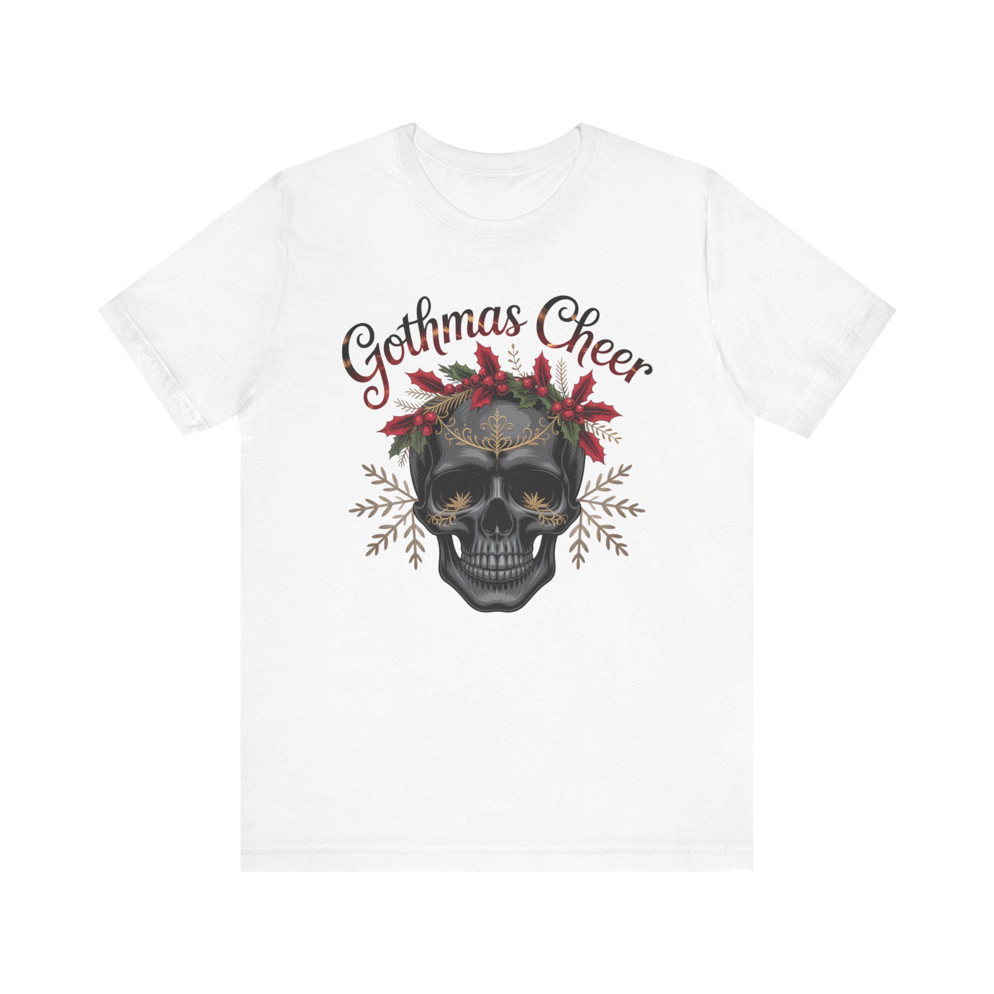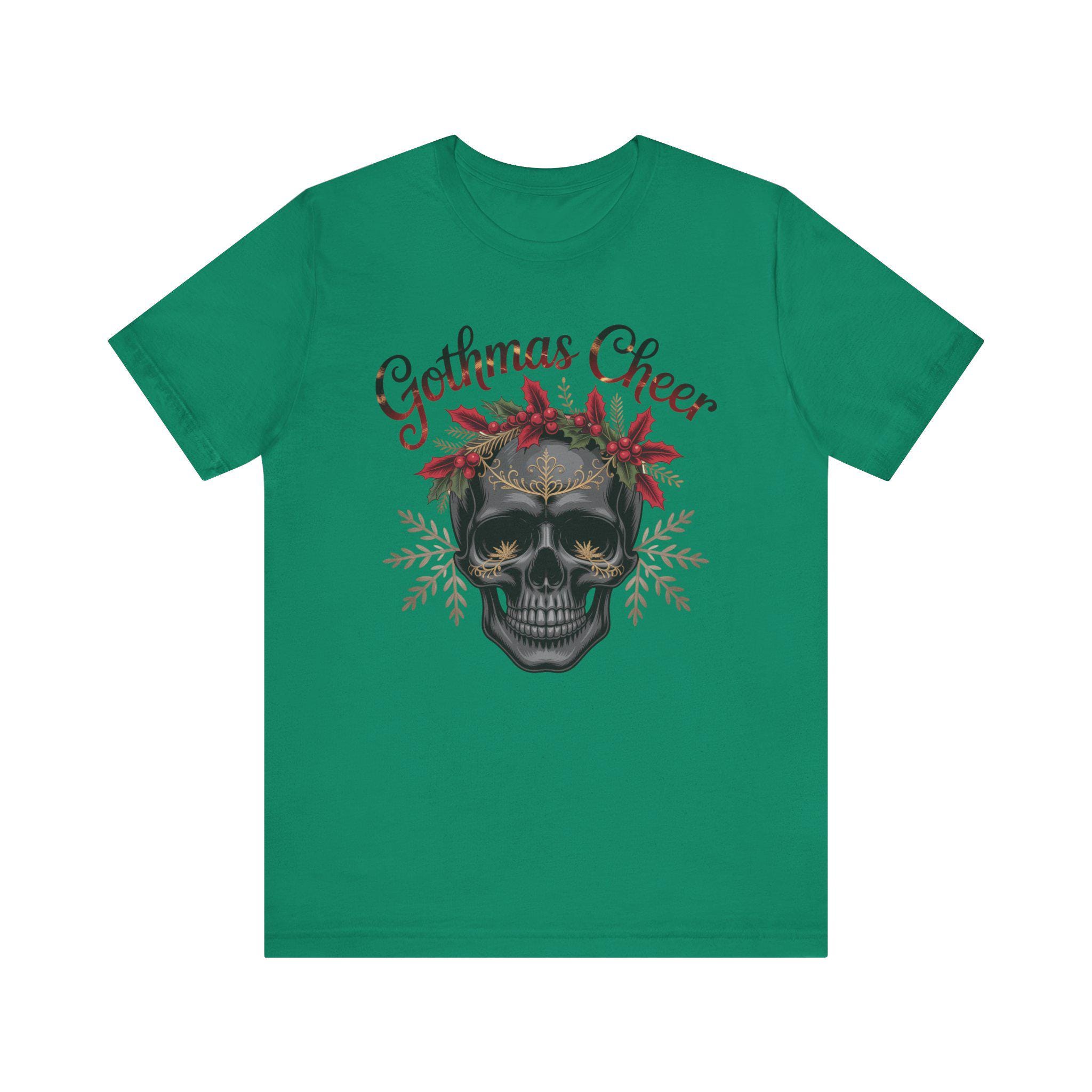This 'Gothmas Cheer' T-Shirt featuring a skeleton head design gives off a spooky and festive vibe, perfect for Halloween enthusiasts and goth lovers. It is great for casual wear during the Halloween season.
