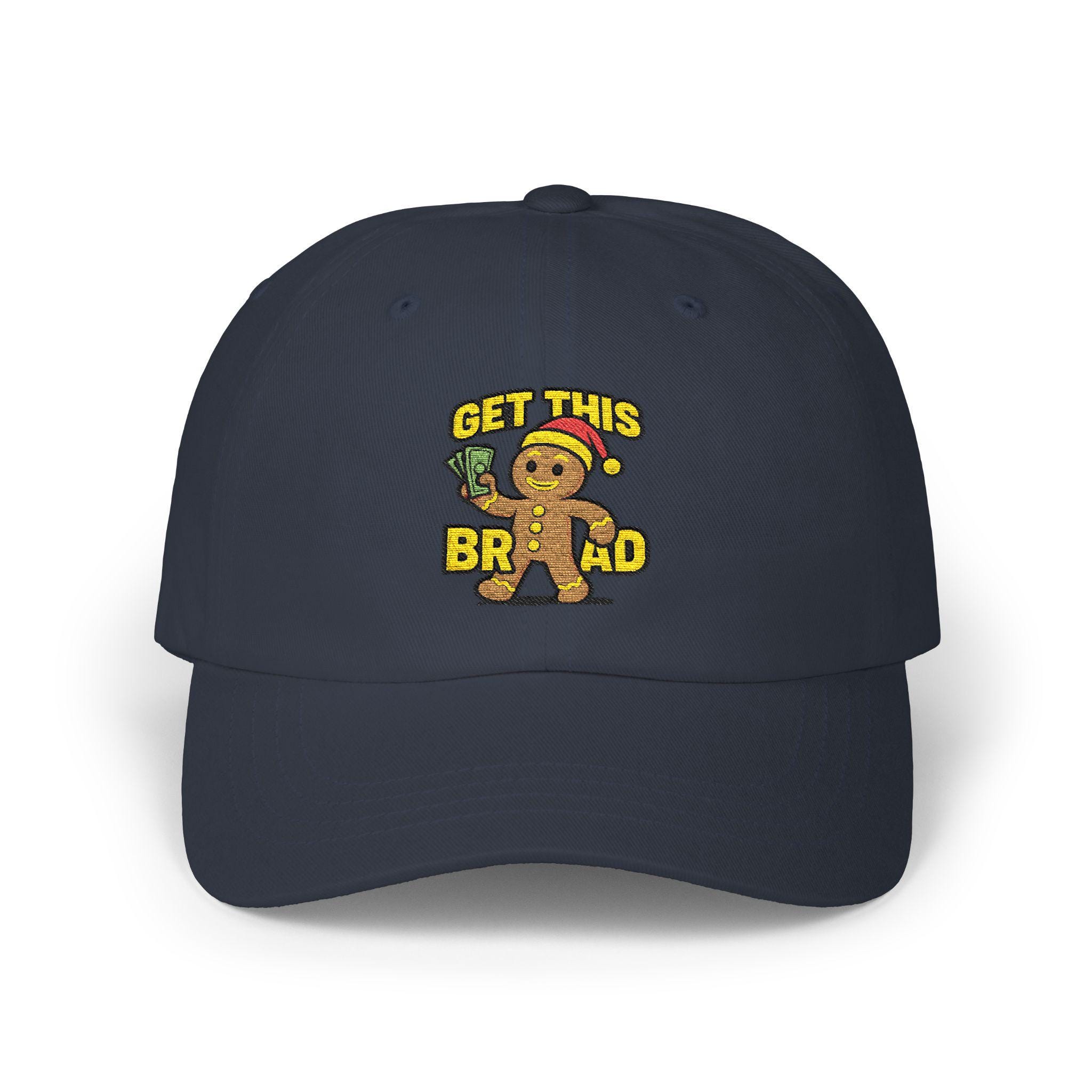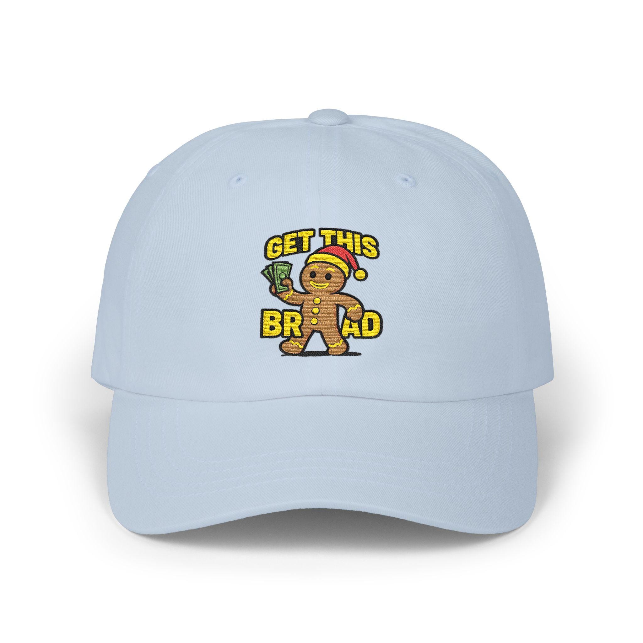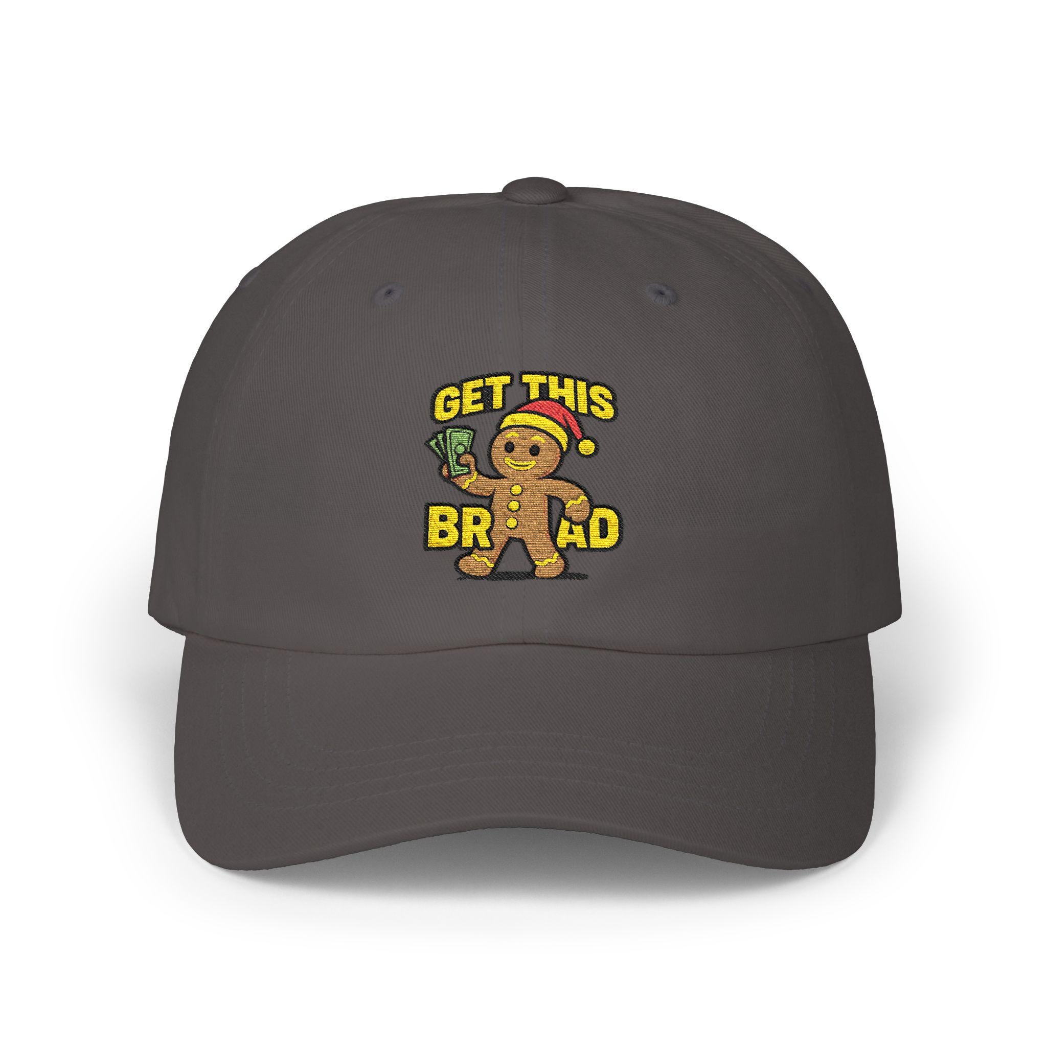 A laid-back, everyday cap with a playful edge. This classic dad cap features a relaxed, low-profile fit and a precurved visor, embroidered with a cheeky gingerbread character holding a bottle and the phrase “GET THIS BREAD.” The soft 100% cotton shell (with a polyester blend option for camo) and breathable eyelets make it comfortable for long wear. An antique-brass adjustable strap tucks away for a clean back profile, and the sewn-in label and visor sticker add authentic, casual detailing. Wear it to bring a little humor to coffee runs, holiday markets, or just sunny afternoons strolling the neighborhood.