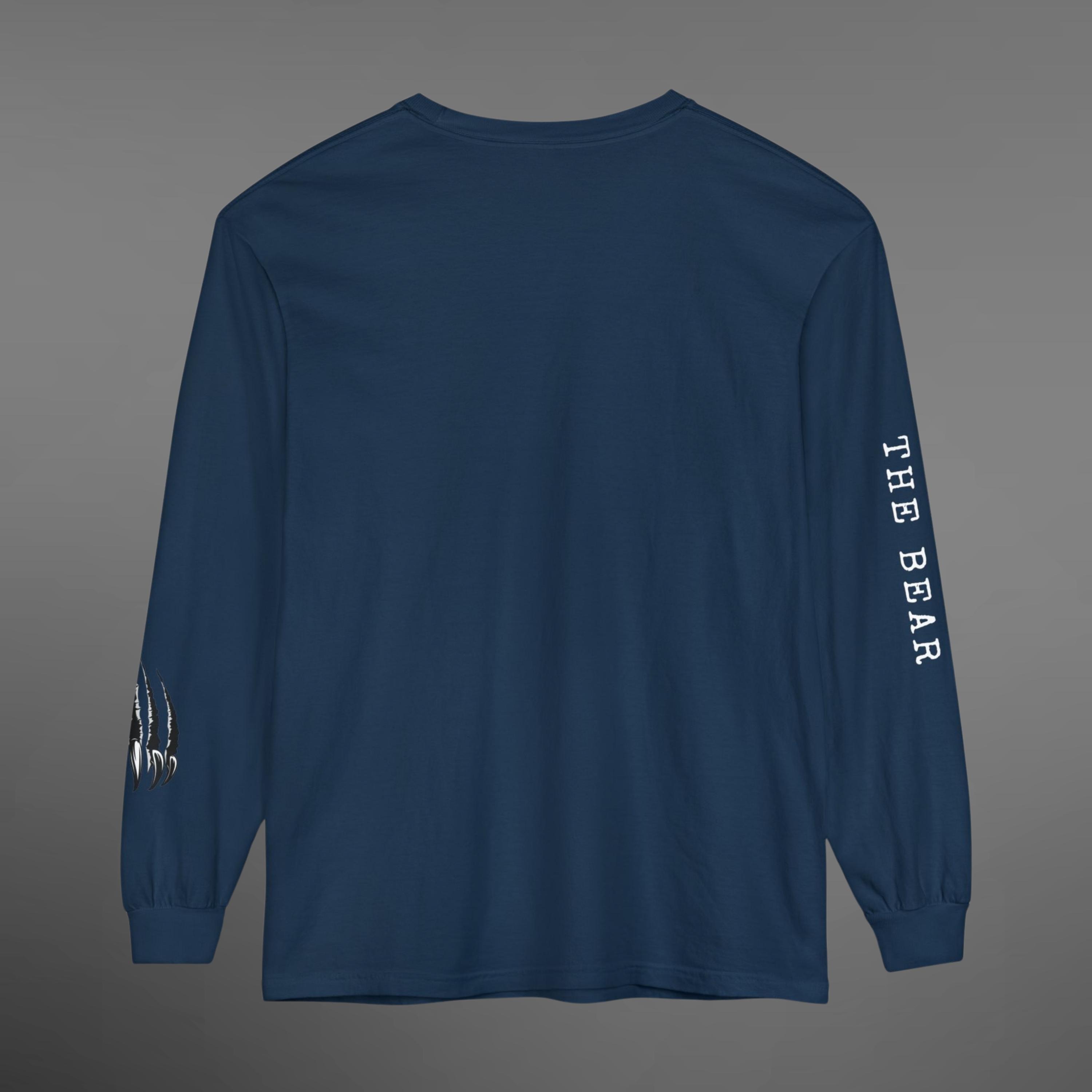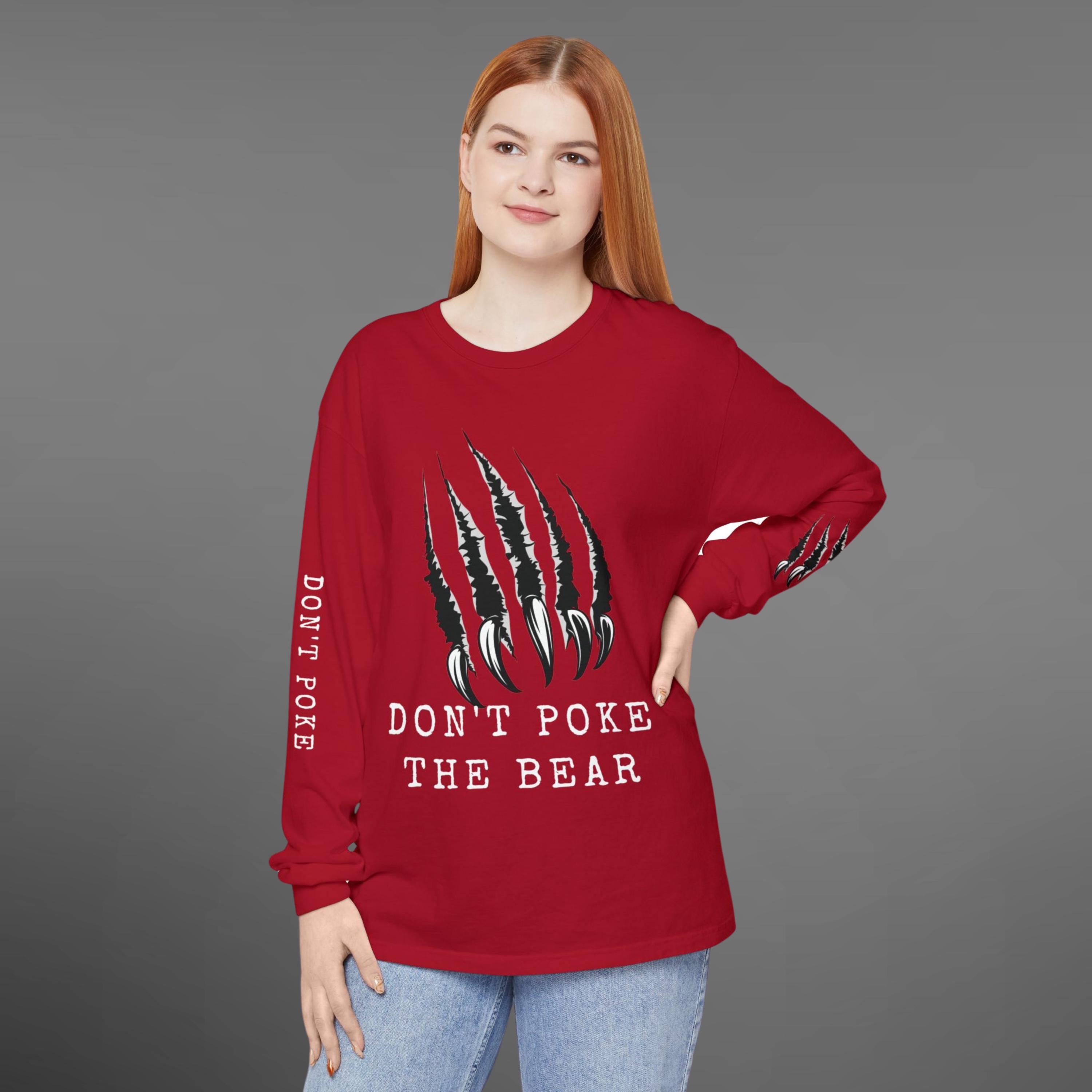 A long-sleeve shirt that feels lived-in from the first wear. The garment-dyed cotton has a soft, muted color and a gentle broken-in texture that promises comfort without fuss. Across the chest, a bold “Don't Poke the Bear” claw mark graphic sits just above the lettering, adding a touch of rugged humor and attitude. It layers easily under jackets for cool mornings or stands alone on chilly evenings. Cuffed sleeves and a classic fit keep the silhouette familiar and wearable. Durable double-needle hems and twill-reinforced neck and shoulder seams mean this shirt holds up to repeat wear and washings, while the ring-spun cotton keeps the print crisp and the hand soft. This is the sort of tee a weekend camper—or anyone who likes a bit of wilderness sass—reaches for when they want something both comfortable and confidently blunt.
