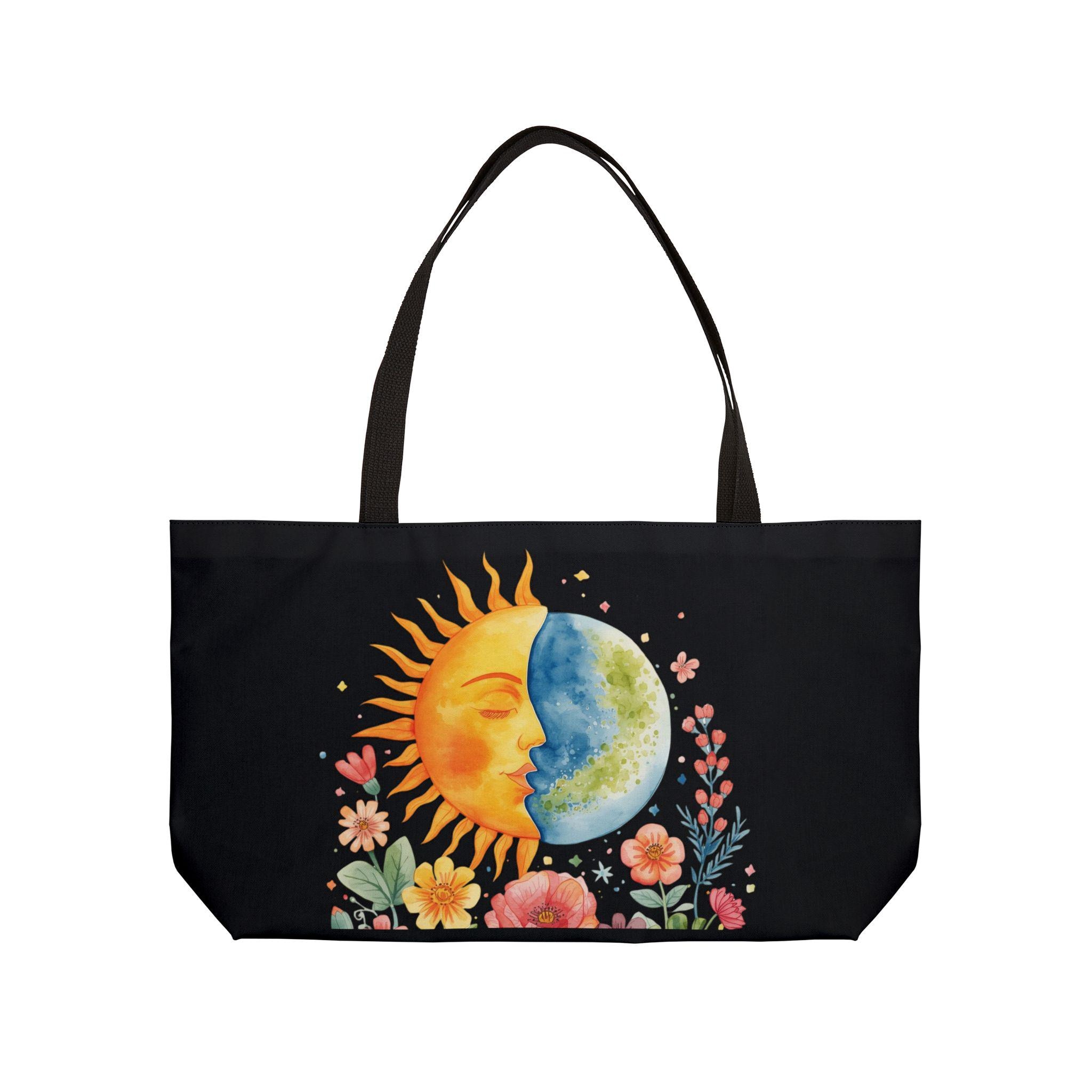 Carry a slice of the cosmos with you — this roomy tote pairs watercolor sun, moon, and blooming florals against a deep black background for a dreamy, hand-painted look. The all-over print wraps around the bag’s T-bottom shape so the scene reads from every angle. Sturdy black woven handles sit comfortably on the shoulder while the black-lined interior keeps contents discreet. Bring it to weekend markets, beach mornings, or art nights and let it hold sketchbooks, market finds, or a light sweater with effortless style.