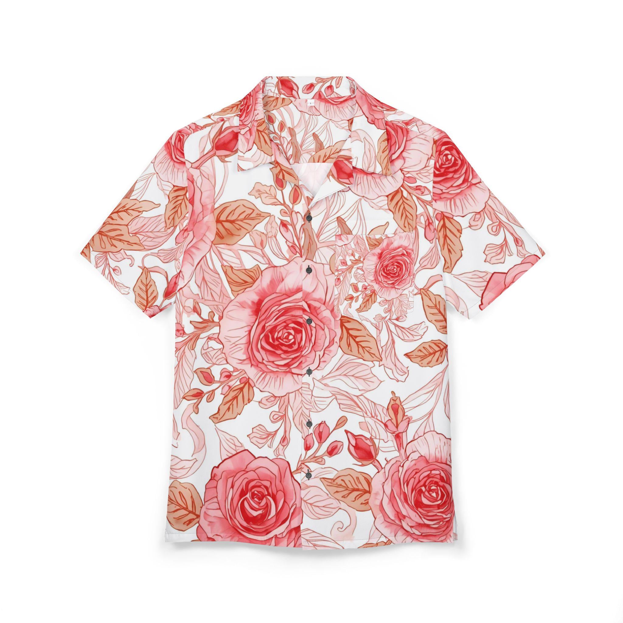 This lightweight button-down brings a garden’s hush to easy summer days. Watercolor roses and soft, terracotta leaves float across a breezy white field, turning casual afternoons into quiet moments of warmth and color. The fabric drapes fluidly, letting air move with you on sandy walks, porch talks, or slow coffee mornings. A structured collar and neat placket keep the look pulled together without fuss — wear it open over a tee or buttoned for a simple, polished silhouette. Hand-stitched details and choice of black or white buttons add a thoughtful finish, while the all-over print keeps the floral scene uninterrupted from front to back.